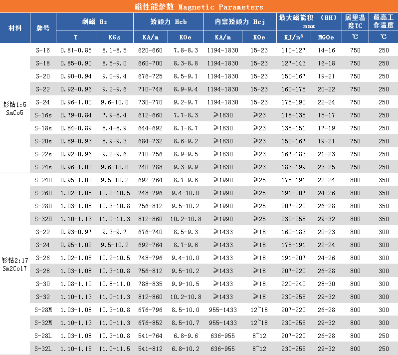 釤鈷永磁材料是由粉末冶金法制成,其化學組合分為SmCo5及SmCo17兩種,是目前磁性能僅次于釹鐵硼的磁性材料此種材料的特點在于它的磁性穩定性和耐溫性,以及較強的抗銹蝕性。其較高工作溫度可達到350攝氏度。廣泛應用于馬達、儀表、傳感器、探測器、雷達及其他高科技領域。